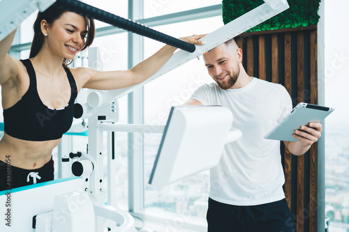 © BullRun, Obraz premium Cheerful woman doing exercises on machine