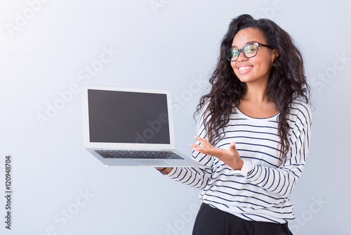 © Viacheslav Yakobchuk, Fototapeta premium Cheerful woman holding laptop