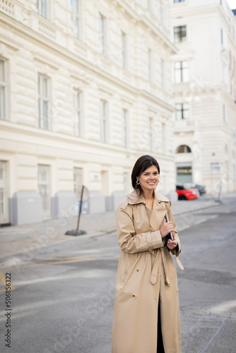 Fototapeta premium cheerful woman in beige trench coat walking with laptop on street in vienna.