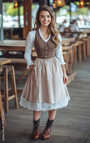 © Vilius, Fototapeta premium Cheerful Woman in Traditional German Attire Holding Beer Steins at Oktoberfest Festival, Smiling Waitress in Bavarian Costume Celebrating German Culture in Festive Event Setting