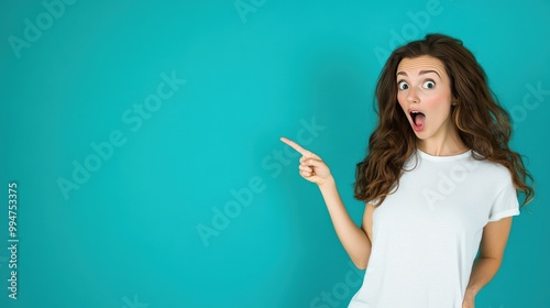 © Unnamed Bird, Fototapeta premium Cheerful Woman Pointing Upward in Surprise