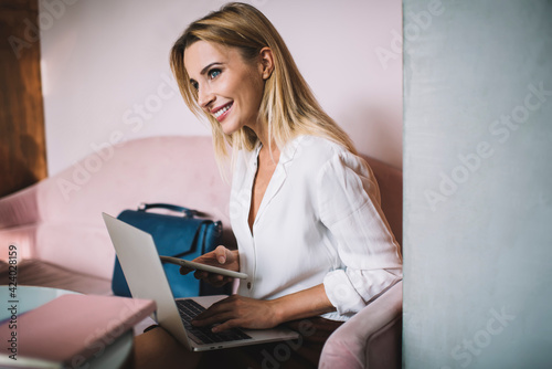 © BullRun, Fototapeta premium Cheerful woman using laptop in office