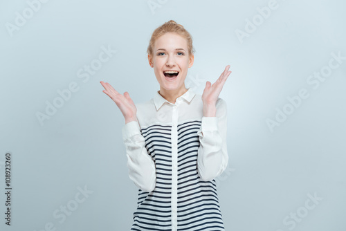 © Drobot Dean, Fototapeta premium Cheerful woman with mouth open looking at camera