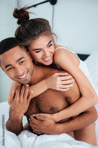 Fototapeta premium Cheerful young couple laughing and embracing on bed