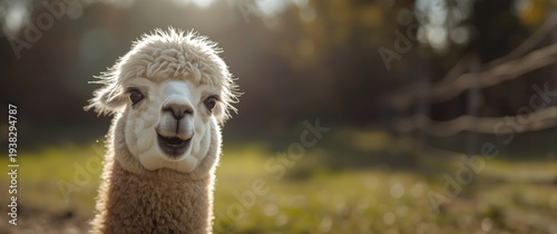 Naklejka premium Cheerful young llama presenting thick fur and copy space in sunny outdoor...
