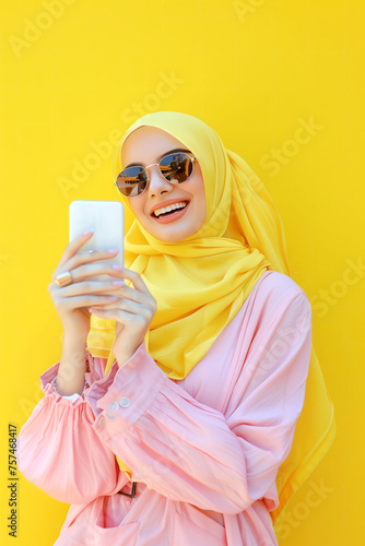 Obraz premium Cheerful Young Muslim Woman in Hijab Using Smartphone on Vibrant Yellow...