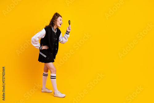 © deagreez, Fototapeta premium Cheerful young student with magnifying glass in trendy jacket posing on bright yellow background, exploring and smiling