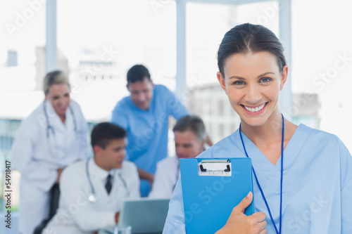 Fototapeta premium Cheerful young surgeon posing with colleagues in background