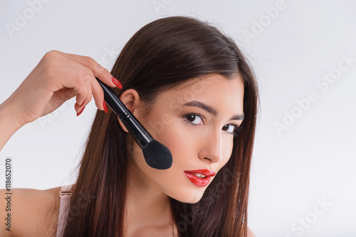 © Yakobchuk Olena, Obraz premium Cheerful young woman doing make-up