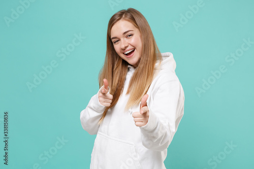 Fototapeta premium Cheerful young woman girl in casual white hoodie posing isolated on blue turquoise background studio portrait. People emotions lifestyle concept. Mock up copy space. Pointing index fingers on camera.