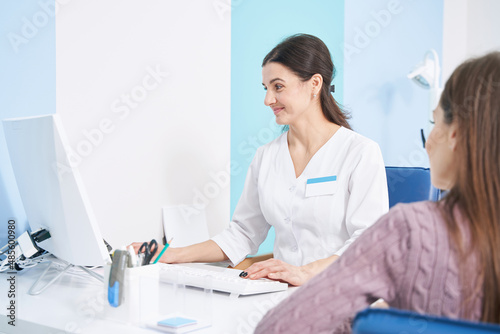 Fototapeta premium Cheerful young woman physician receiving her patient