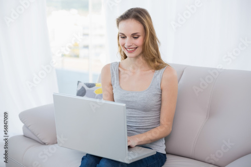 © lightwavemedia, Naklejka premium Cheerful young woman sitting on couch using laptop
