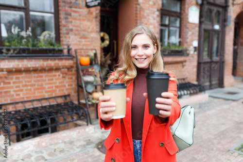 Fototapeta premium Cheerful young woman wearing red coat walking with coffee cup