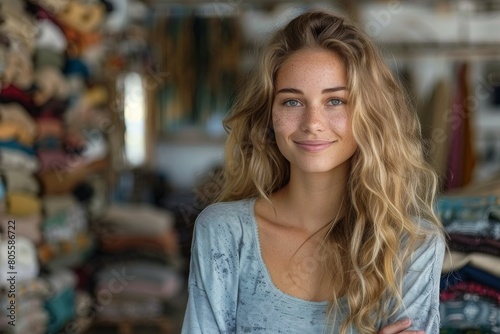 © Larisa AI, Fototapeta premium Cheerful young woman with curly blonde hair standing in front of various textiles in a shop, exuding positivity