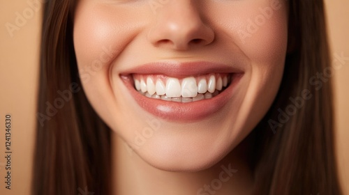 © The 2R Artificiality, Obraz premium Cheerful young woman with long brown hair showcases a bright toothy smile against a warm beige background, radiating positivity and professional confidence.