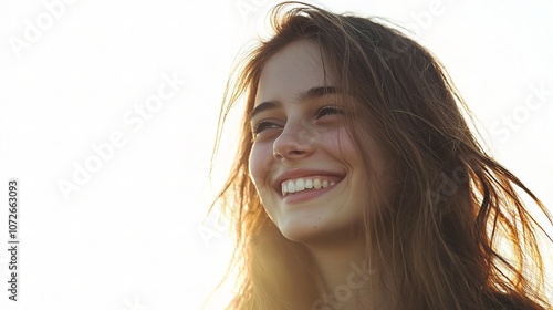 © WS Studio 1985, Fototapeta premium Cheerful Young Woman with Long Hair Smiling Brightly in Natural Light Capturing a Moment of Joy and Happiness Outdoors in a Soft and Dreamy Atmosphere