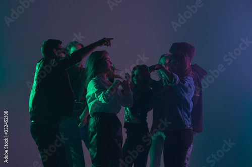 Fototapeta premium Cheering dance party, performance concept. Crowd shadow of people dancing with neon colorful lights raised hands up on dark background. Celebration, holiday, weekend, nightlife and positive vibes.