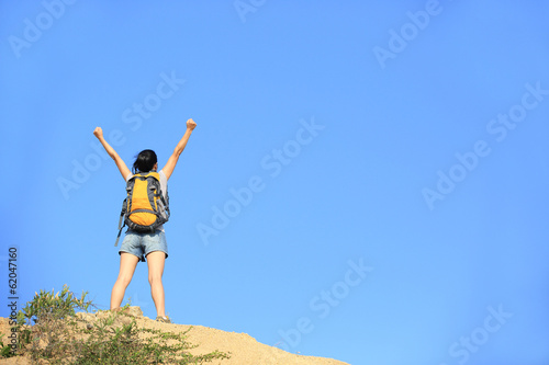 Obraz premium cheering hiking woman open arms desert mountain peak