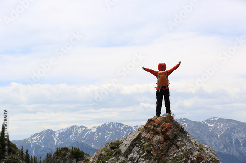 Obraz premium cheering successful woman backpacker open arms on mountain peak