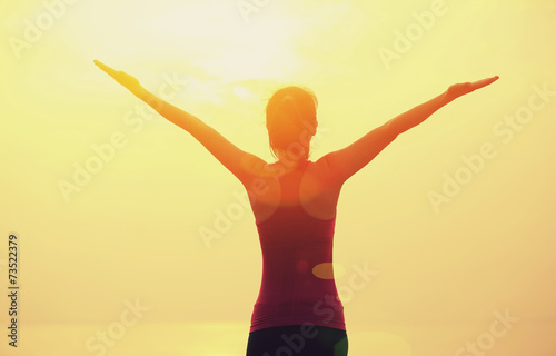 Obraz premium cheering woman hiker open arms at sunrise seaside