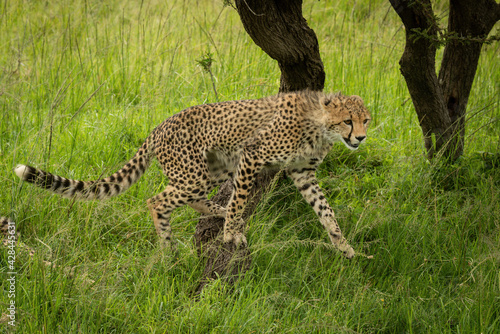 © Nick Dale, Obraz premium Cheetah cub jumps from tree into grass