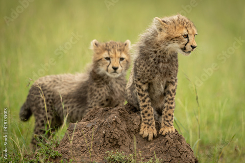 © Nick Dale, Obraz premium Cheetah cub stands on mound with another