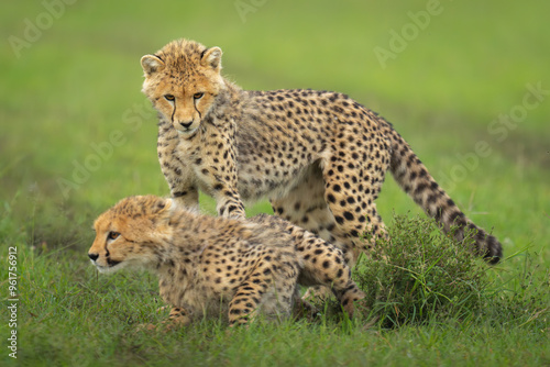 © Nick Dale, Fototapeta premium Cheetah cub stands over sibling on grass