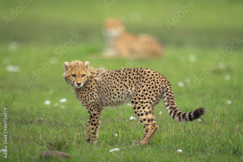 © Nick Dale, Fototapeta premium Cheetah cub stands with mother in background