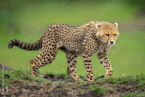 © Nick Dale, Fototapeta premium Cheetah cub walks along ridge lifting forepaw