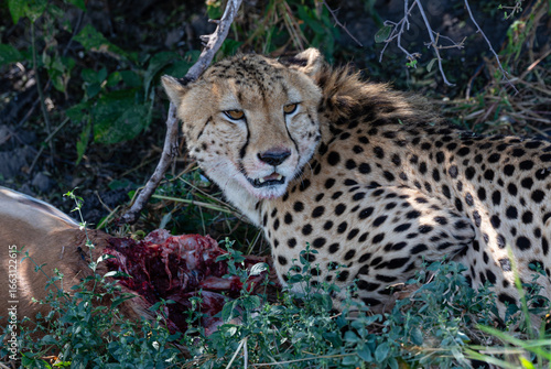 © Louis, Fototapeta premium Cheetah feeding at a kill and looking at camera