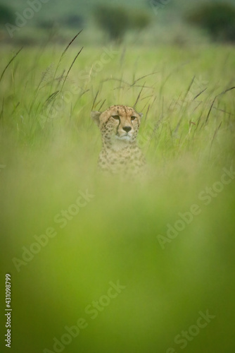 © Nick Dale, Fototapeta premium Cheetah sits staring ahead in blurred grass