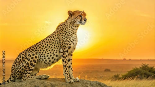 © Katewaree, Obraz premium Cheetah sitting atop a rock, silhouetted against a stunning sunset in the savannah, showcasing its unique spots and elegance.