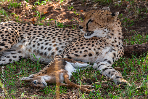 © Victor, Fototapeta premium Cheetah with prey under tree. Masai Mara, Kenya