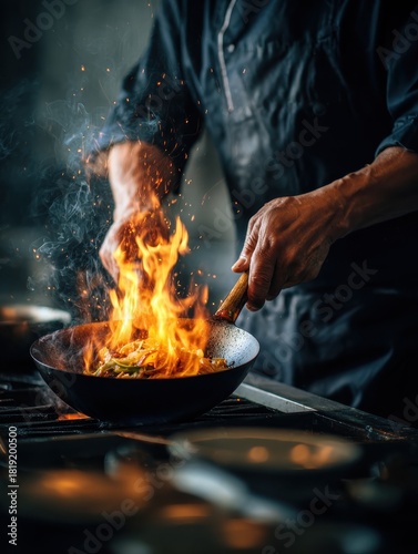 © Johannes, Fototapeta premium chef hands keep wok with fire closeup chef hands cook food with fire chef man burn food at professional kitchen no logos no brands ar 34