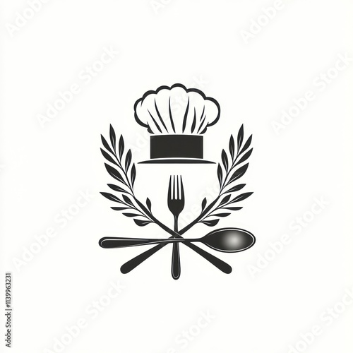© lestari, Fototapeta premium Chef hat, crossed cutlery, and olive branches logo.