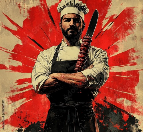 Fototapeta premium Chef with Knife and Meat Skewer Illustration, Vintage Style Fast Food Kebab Logo