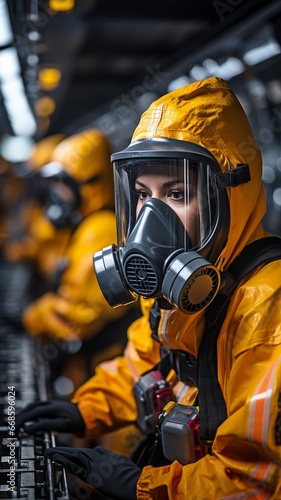 Naklejka premium chemical industry worker donning gas masks and PPE safety gear .