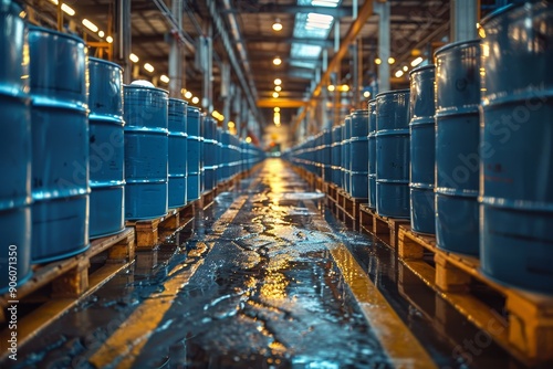 © Matvejs, Fototapeta premium Chemical warehouse blue metal barrels on pallets in chemical product storage facility