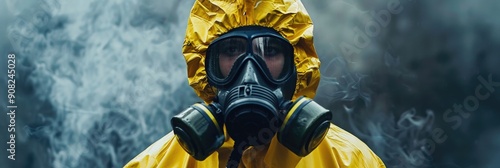 Naklejka premium Chemical Worker in Yellow Protective Suit and Gas Mask Producing Sulfuric...