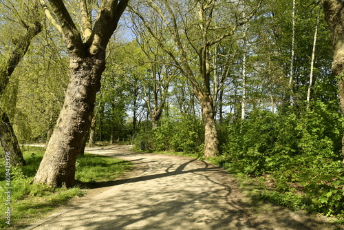 © Photocolorsteph, Naklejka premium Chemin en gravier beige entre végétation luxuriante au domaine provincial de Kessel-Lo à Louvain