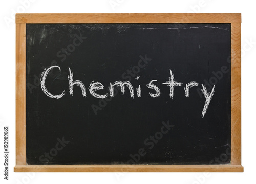 © clsdesign, Obraz premium Chemistry written in white chalk on a black chalkboard isolated on white