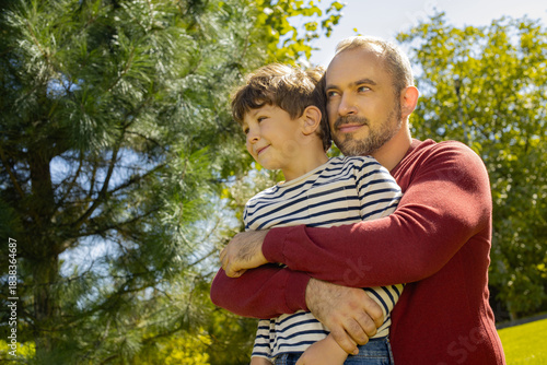 Fototapeta premium Cherishing moments between father and son at a sunlit park