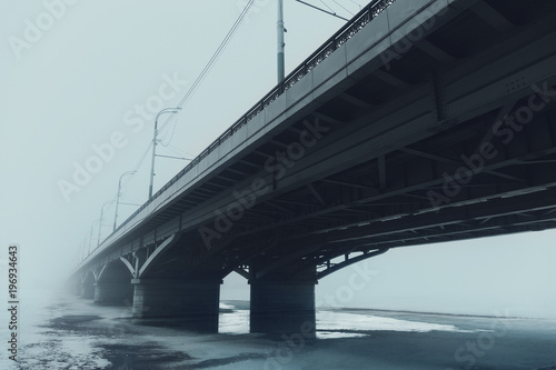 Naklejka premium Chernavsky bridge in fog in Voronezh, perspective, blue toned