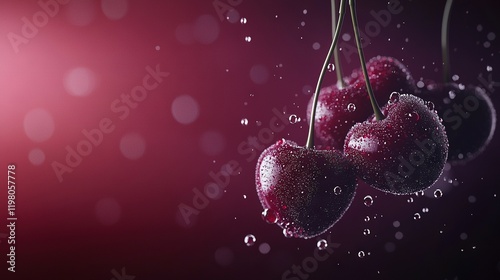 Fototapeta premium Cherries hang in clusters from a tree's branches, glistening with droplets of...