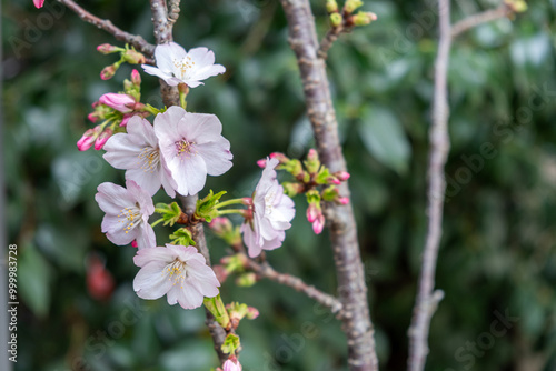 Fototapeta premium Cherry bloosom, blooming cherry tree closeup. Springtime, sakura tree flowers in Japan