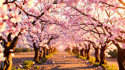 Fototapeta premium Cherry blossom alley in Japan, petals floating in the air, shallow depth of field, warm golden hour lighting