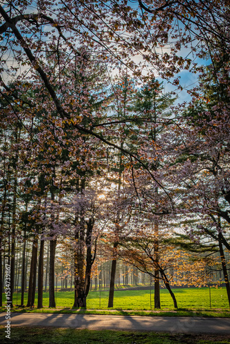 © 模公 黒川, Fototapeta premium Cherry blossom avenue at sunset, Nijuukan Road, Hokkaido Japan