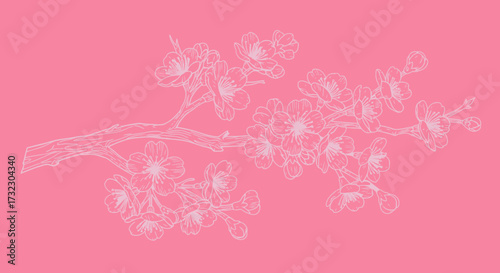 © gudangPIXEL, Naklejka premium Cherry blossom branch in light outline against pink background