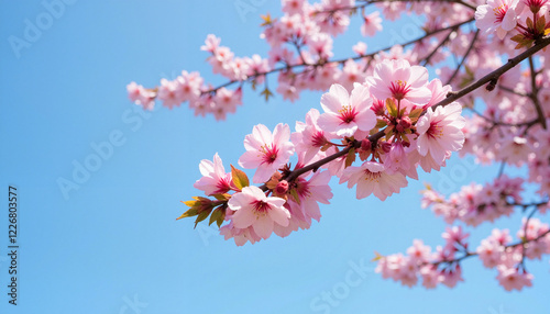 © Baron Von Fedorov, Obraz premium Cherry blossom branch with pink flowers against blue sky