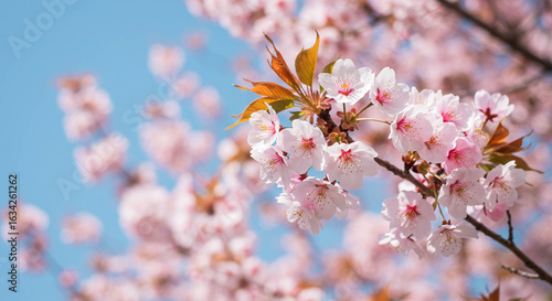 © Elbrandan, Obraz premium Cherry Blossom Branch with Pink Flowers Against Blue Sky